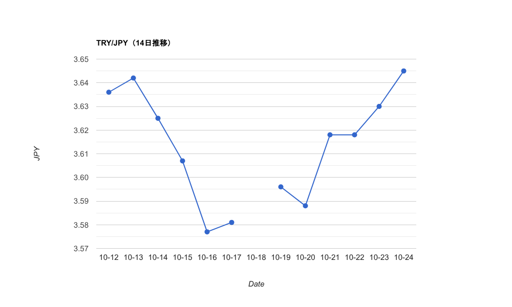 **終値(TRY/JPY):3.645円 前日比:+1.5pips(0.413%)**