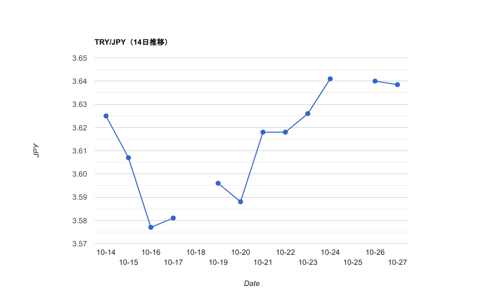 **終値(TRY/JPY):3.639円 前日比:-0.2pips(-0.041%)**