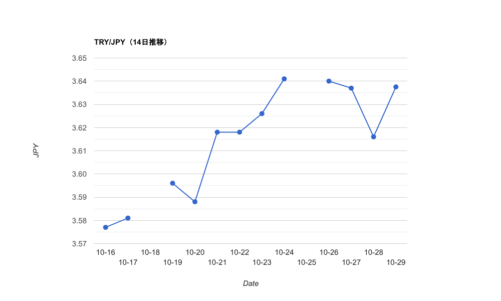 終値(TRY/JPY):3.638円 前日比:+2.2pips(0.595%)