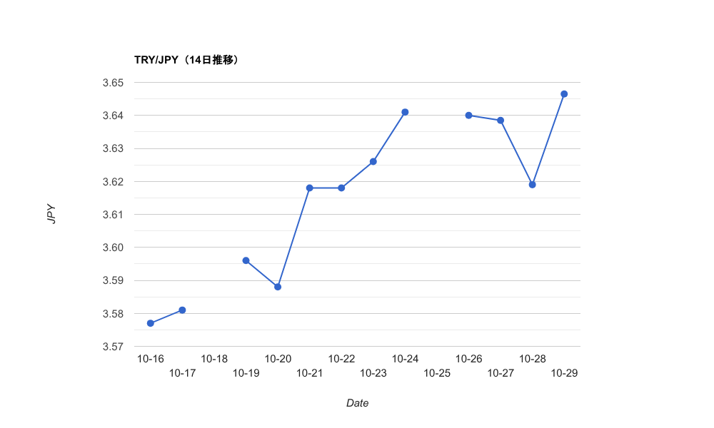 終値(TRY/JPY):3.647円 前日比:+2.7pips(0.76%)