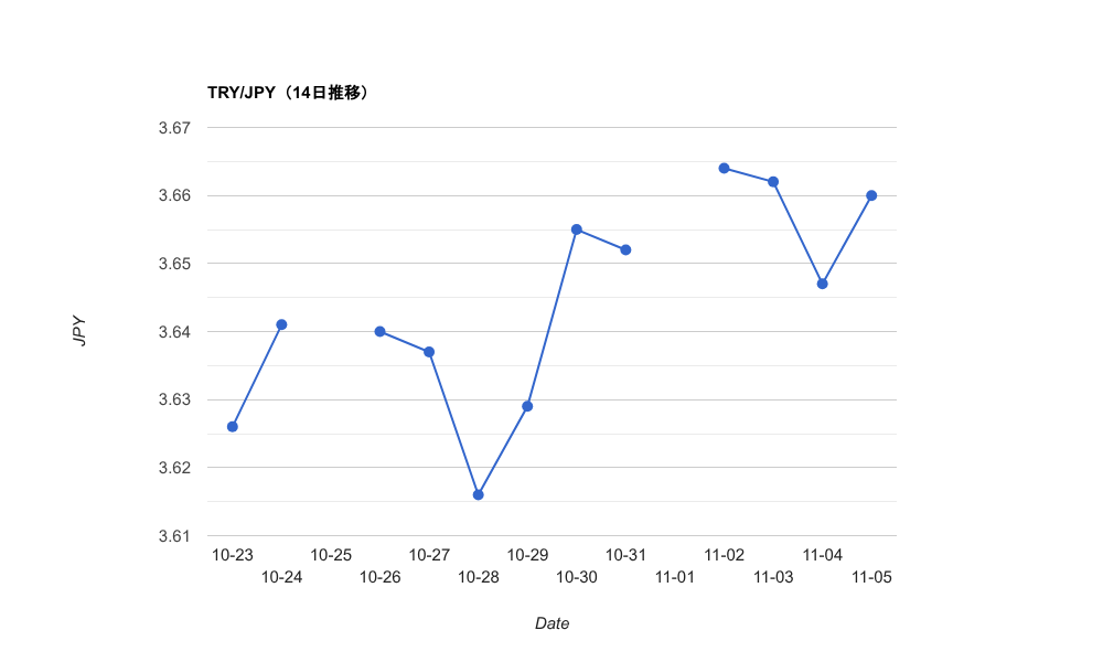 終値(TRY/JPY):3.66円 前日比:+1.3pips(0.356%)