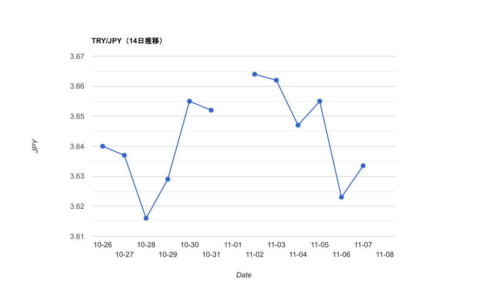 終値(TRY/JPY):3.634円 前日比:+1pips(0.29%)