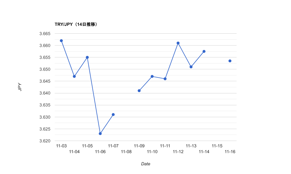 終値(TRY/JPY):3.654円 前日比:-0.4pips(-0.109%)