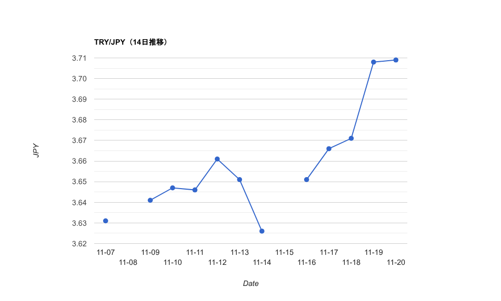 終値(TRY/JPY):3.709円 前日比:+0.1pips(0.027%)