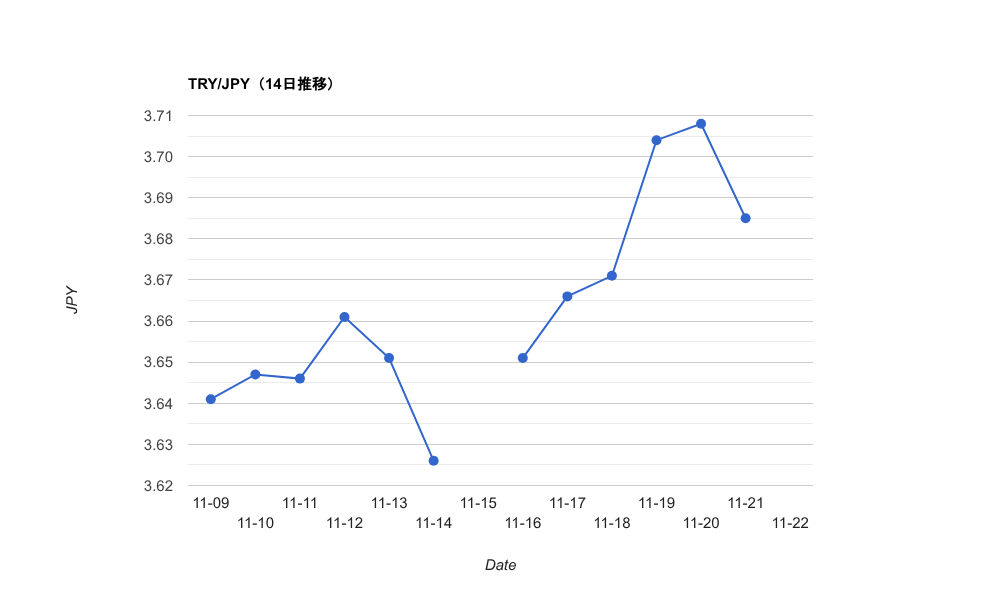 終値(TRY/JPY):3.685円 前日比:-2.3pips(-0.62%)