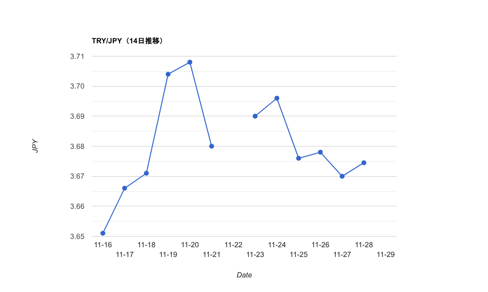 終値(TRY/JPY):3.675円 前日比:+0.5pips(0.123%)